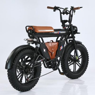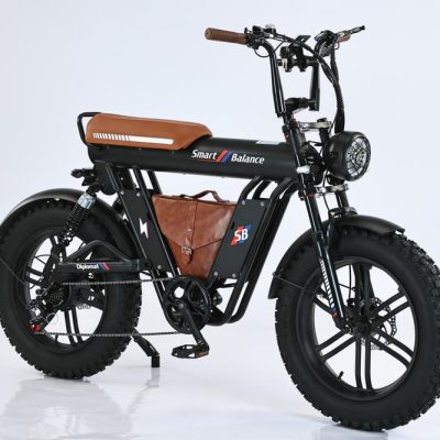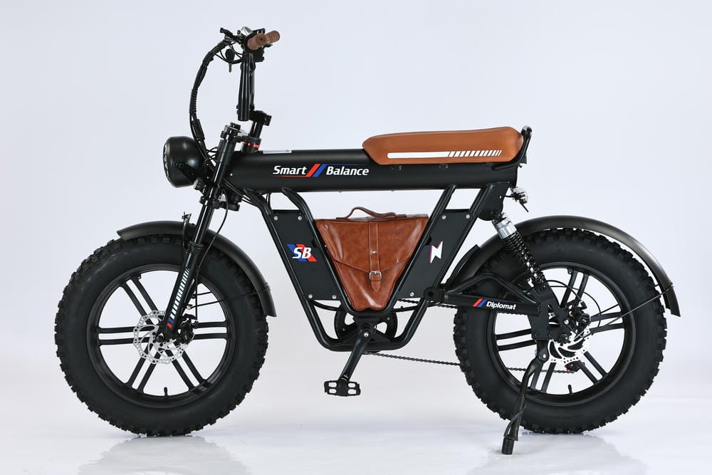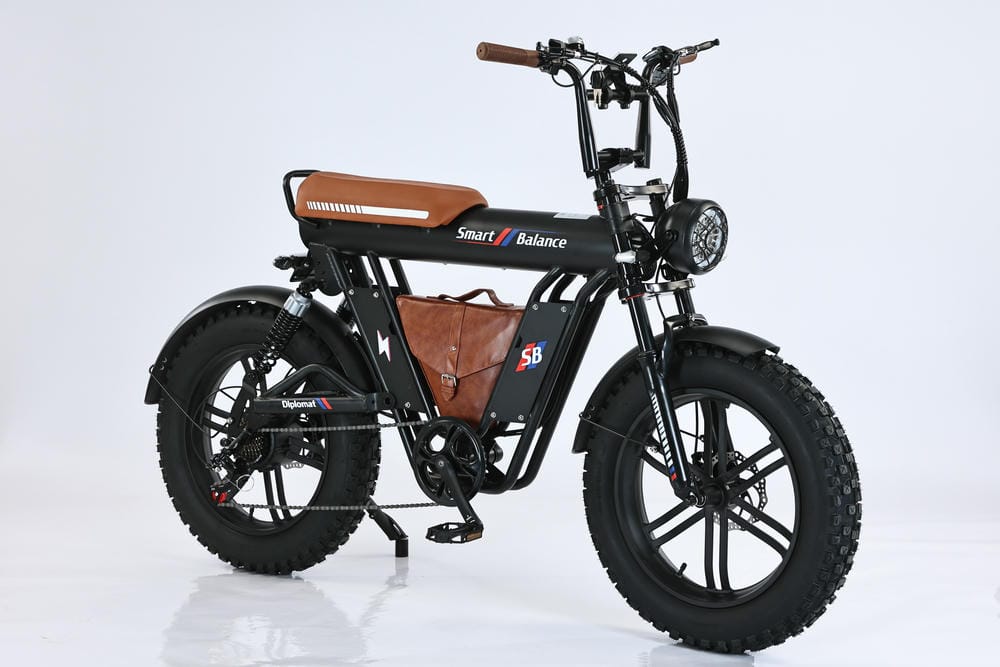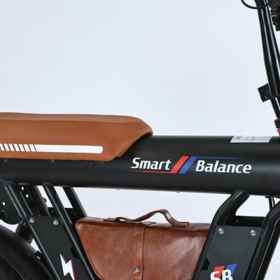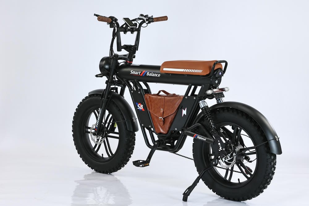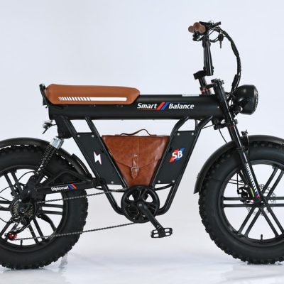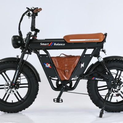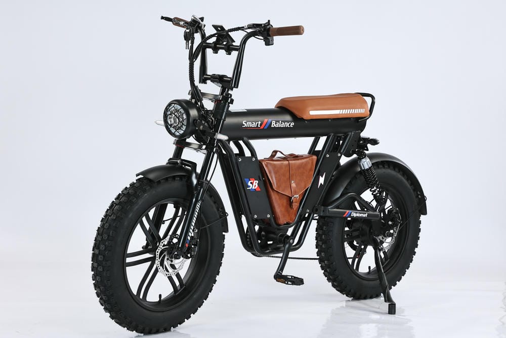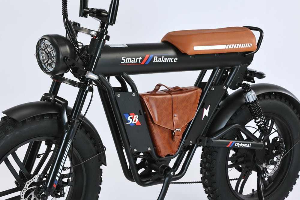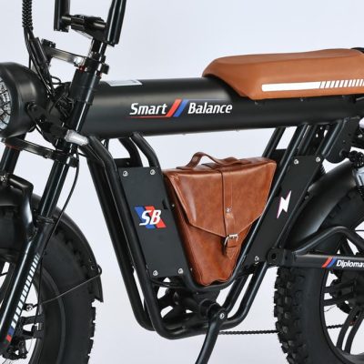 SmartBalance Diplomat — это электрический фэтбайк с необычным дизайном и названием, благодаря “дипломату” — удобной сумке для перевозки вещей, которая идет в комплекте. Эта модель обеспечивает комфортную езду с помощью широких покрышек, позволяющих преодолевать сложные участки дороги, и 4 амортизаторов: двух спереди и двух сзади. Все органы управления сосредоточены на руле: слева — кнопка звукового сигнала, модуль управления светом и поворотниками, рычаг тормоза и модуль управления электропередачами; справа — переключатель механических передач, курок газа и рычаг тормоза. В центре размещен дисплей бортового компьютера. Аккумуляторная батарея на 20 Ач находится под сиденьем, остается быстросъемной и обеспечивает оптимальный баланс между запасом хода и весом велосипеда. С 7 скоростями от Shimano, Diplomat справится с бездорожьем и сложными участками, такими как грязь или песок, благодаря пониженным передачам.